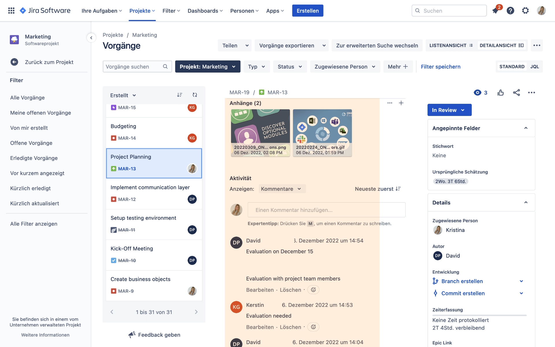 Umgekehrt bedeutet dies auch, dass Sie laufend aktuelle Informationen über die Ist- und Fortschrittsdaten der in Jira arbeitenden Entwickler erhalten. Dies beinhaltet: