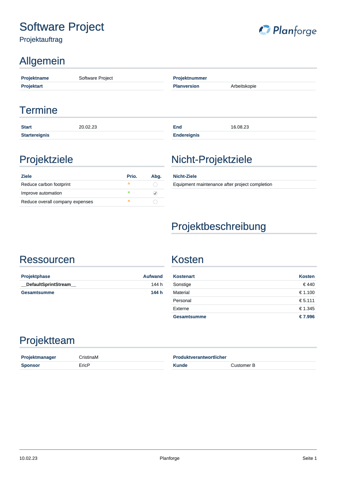 Dies geschieht in der Regel über einen Projektauftrag, der Meta-Informationen wie den aktuellen Projektplan, die Aufwands- und Kostenaufschlüsselung, die Meilensteinliste und den Risikoplan enthält.