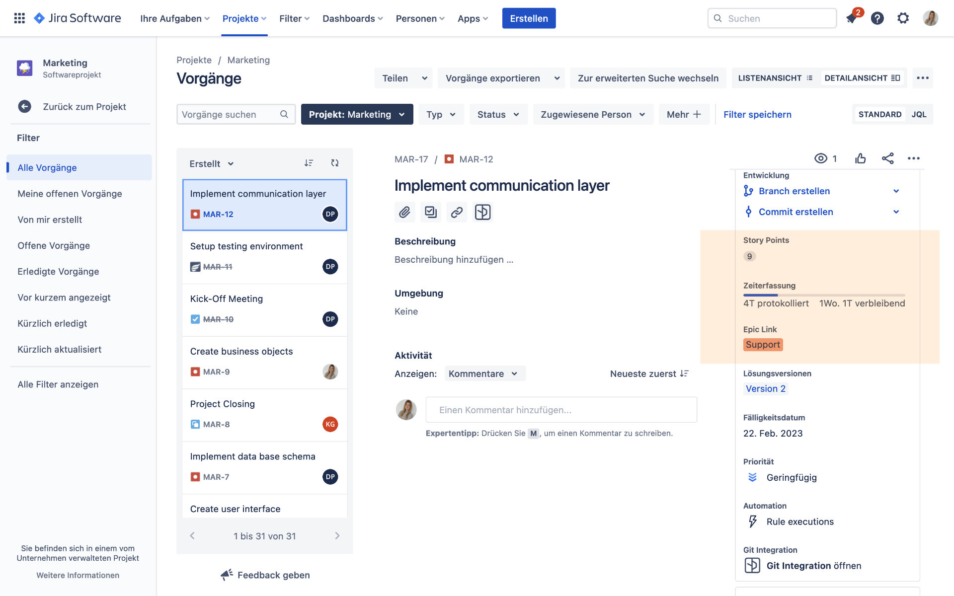 Abbildung 14: Synchronisierte Kommentare in Jira (orange markiert)