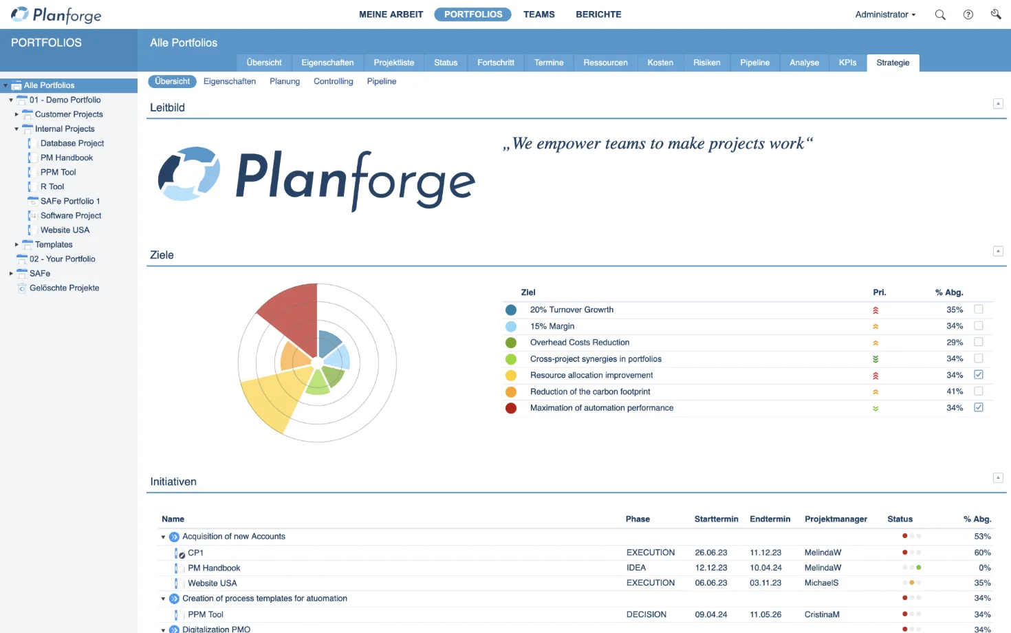 Aufgrund des starken Wettbewerbs und der sich schnell verändernden Märkte ist es wichtiger denn je, auf ein gemeinsames Unternehmensziel hinzuarbeiten. Planforges Lösung für strategisches Management erleichtert es Teammitgliedern, die Unternehmensstrategie zu verstehen und auszuführen, während das Management mit relevanten strategischen Daten versorgt wird.